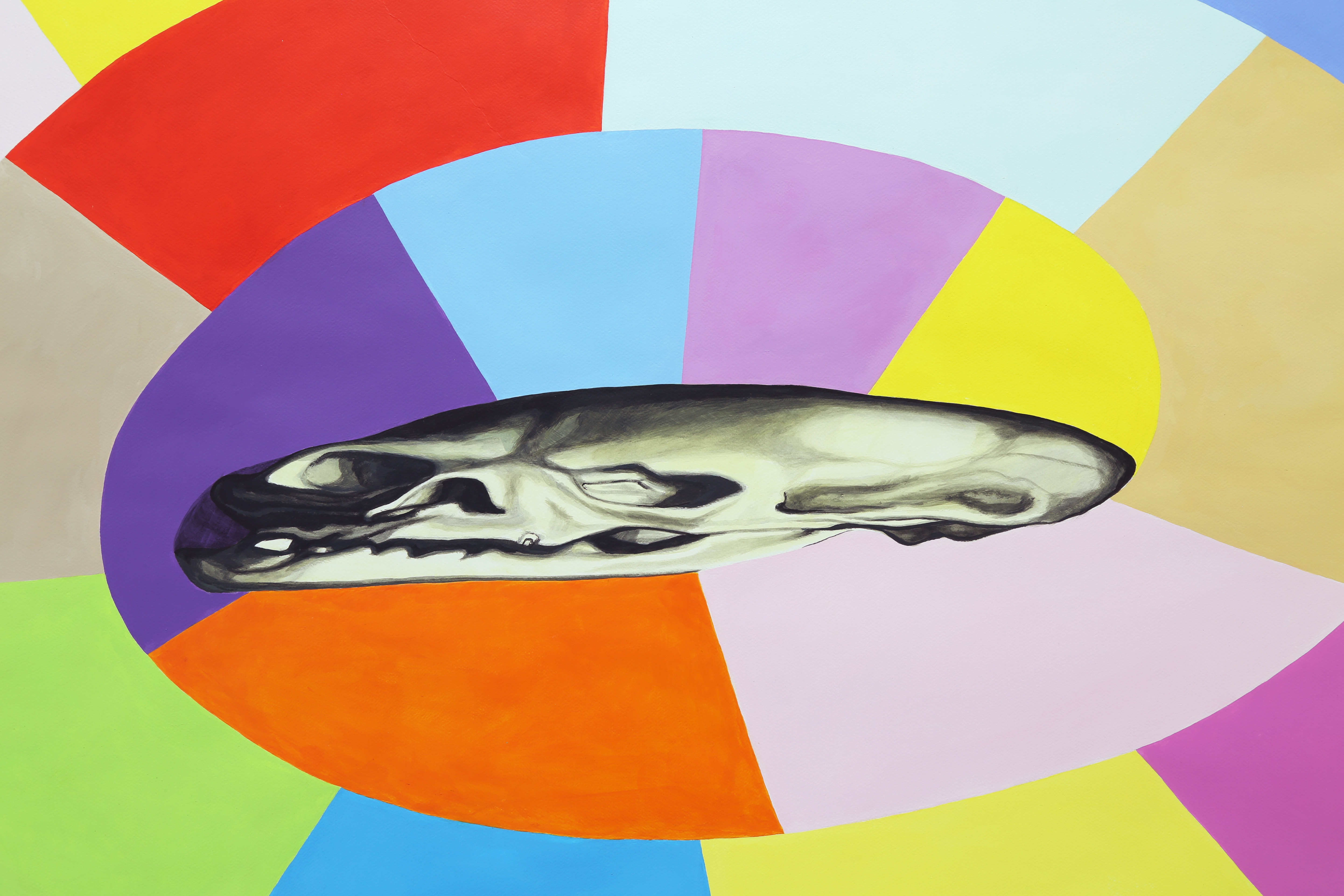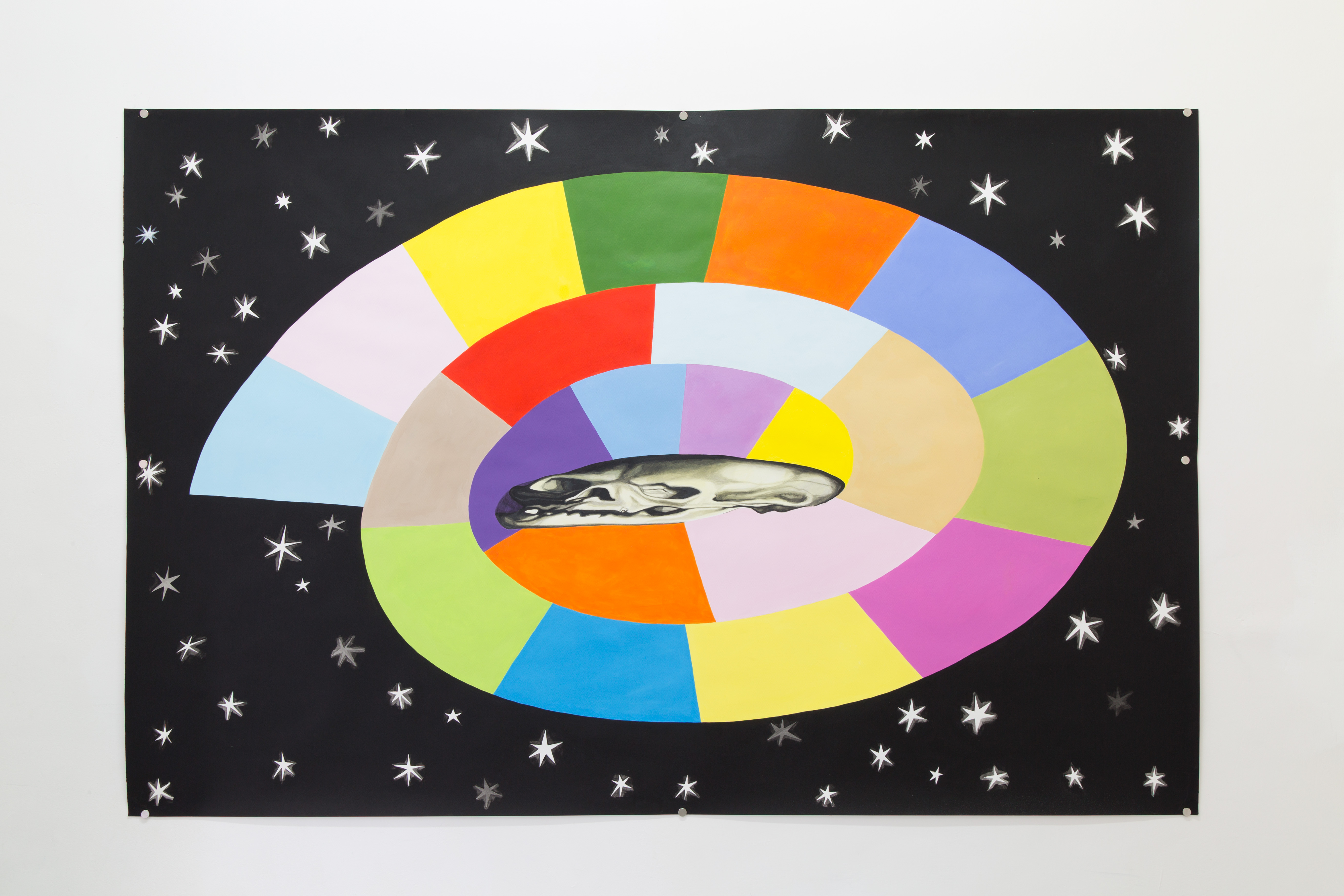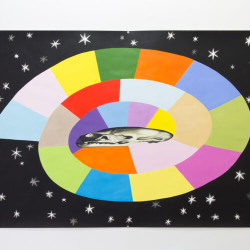 Dans Marelle, j’ai représenté un jeu de marelle presque grandeur nature qui mène à une anamorphose d’un crâne, que j’ai empruntée au tableau « Les Ambassadeurs » de Holbein. Ce jeu d’enfants représente un rite de passage, un moment de transition – de l’enfance à l’âge adulte, de la vie à la mort – où l’on passe d’une position asymétrique et instable (sur une jambe) à une position symétrique et stable (debout sur les deux jambes). C’est un motif qui pourrait être lié aux labyrinthes que l’on trouve dans certaines cathédrales (à Ravenne ou à Auxerre par exemple), qui servaient à des danses circulaires pendant le carnaval et représentaient peut-être aussi le cheminement des pèlerins vers la rédemption. C’est un dessin qui évoque le changement et le cheminement sur lequel nous nous trouvons.