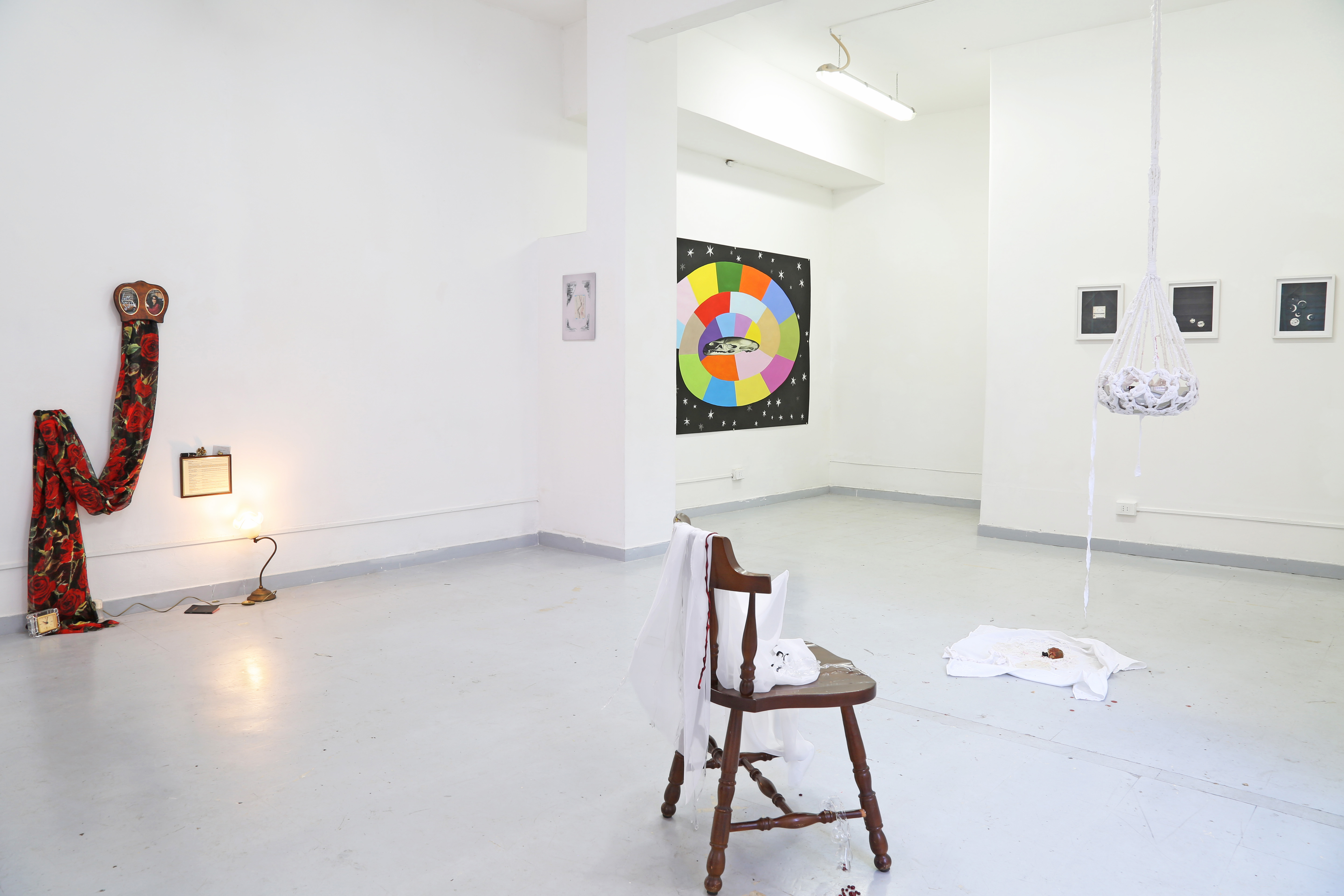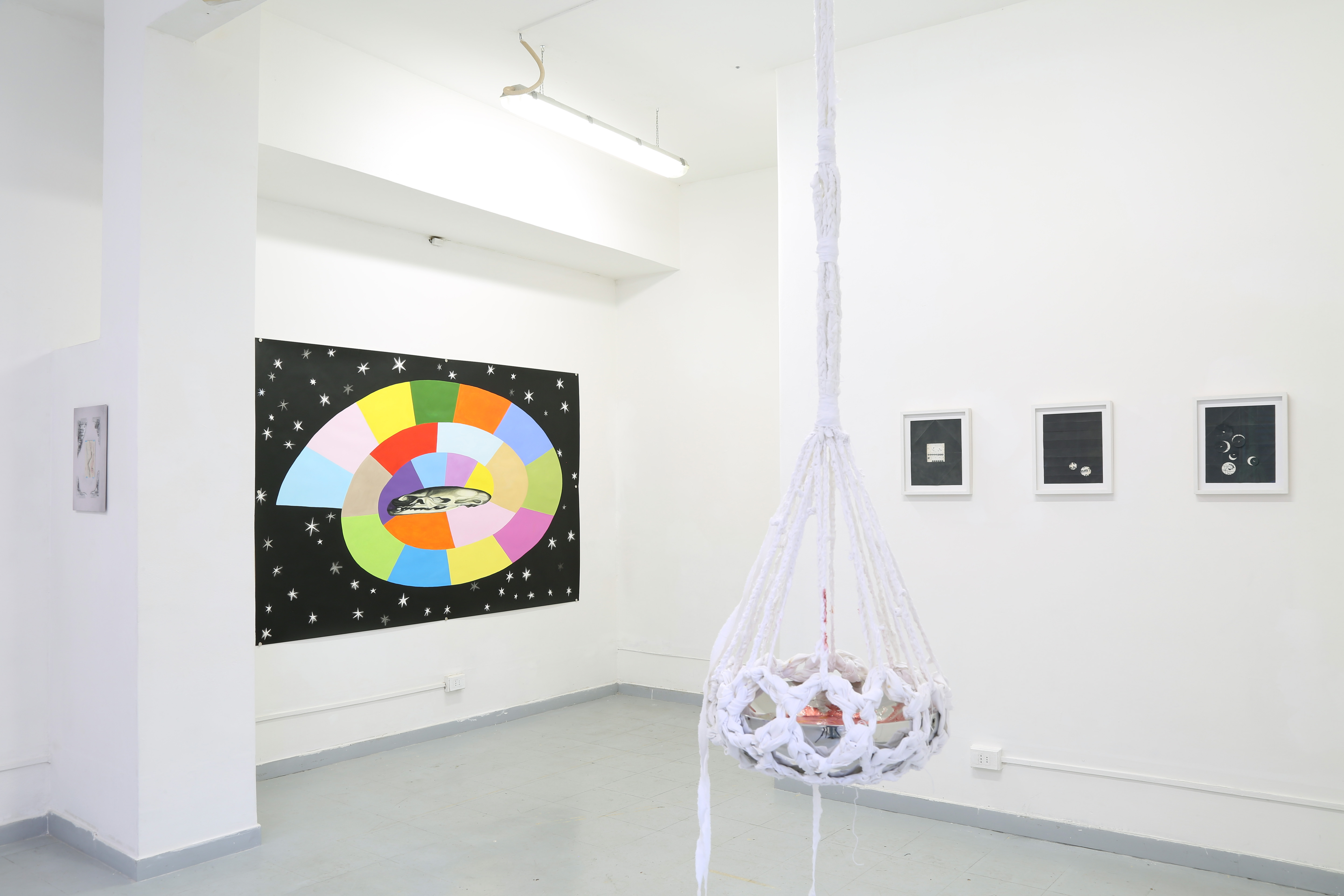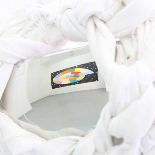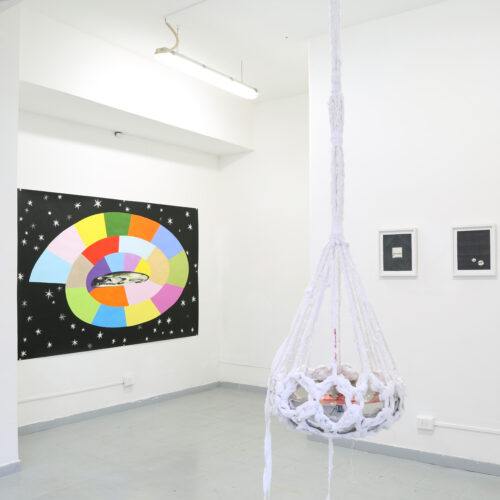Cet espace est pourvu de son propre système d’éclairage, rendant inutile celui du lieu d’exposition, qui est éteint. La lumière met en valeur la blancheur opaque du papier mâché à l’intérieur tandis qu’elle révéle, vue de l’extérieur, des transparences similaires aux lanternes du carnaval de Bâle. Le contraste entre l’intérieur et l’extérieur de l’espace crée une expérience immersive. Le public est invité à y voir mes travaux, présentés à la manière d’une exposition classique.